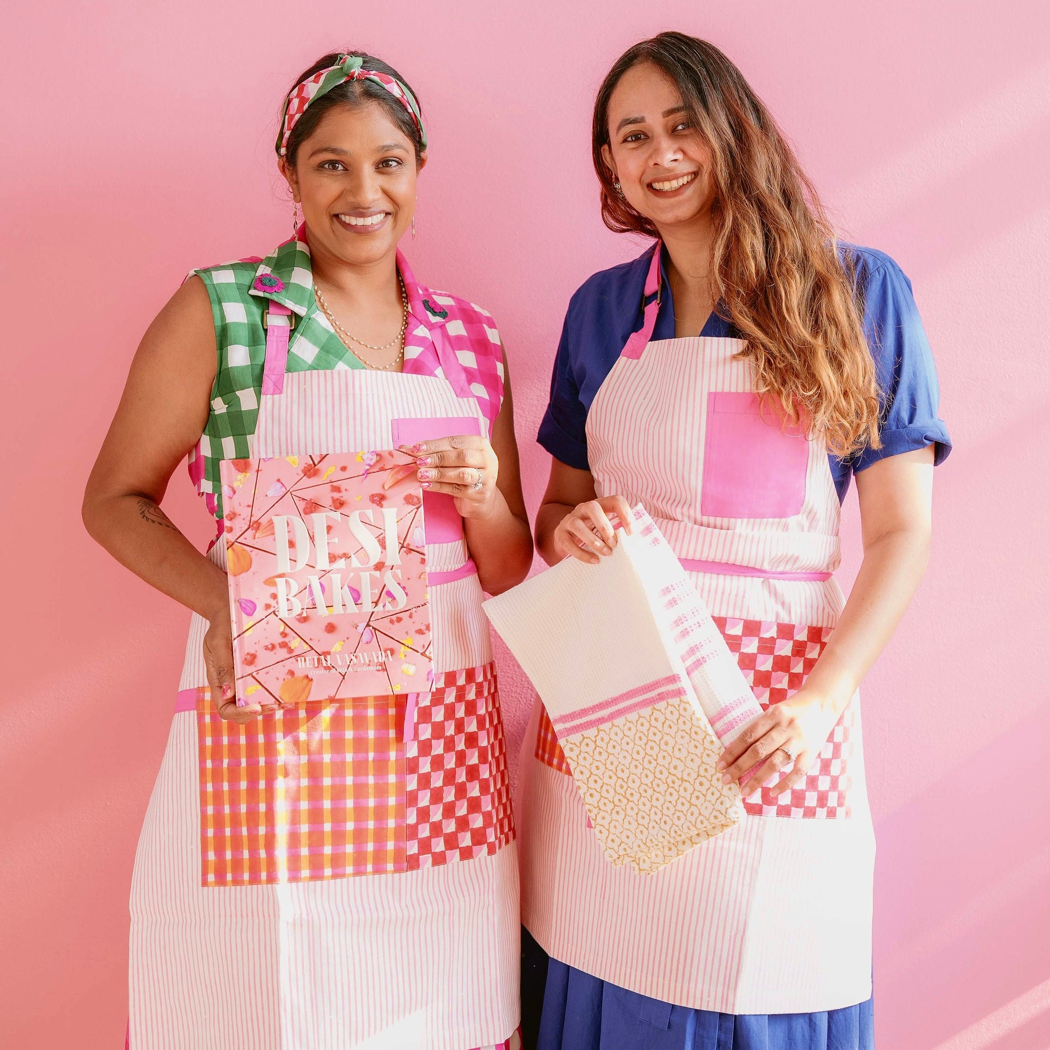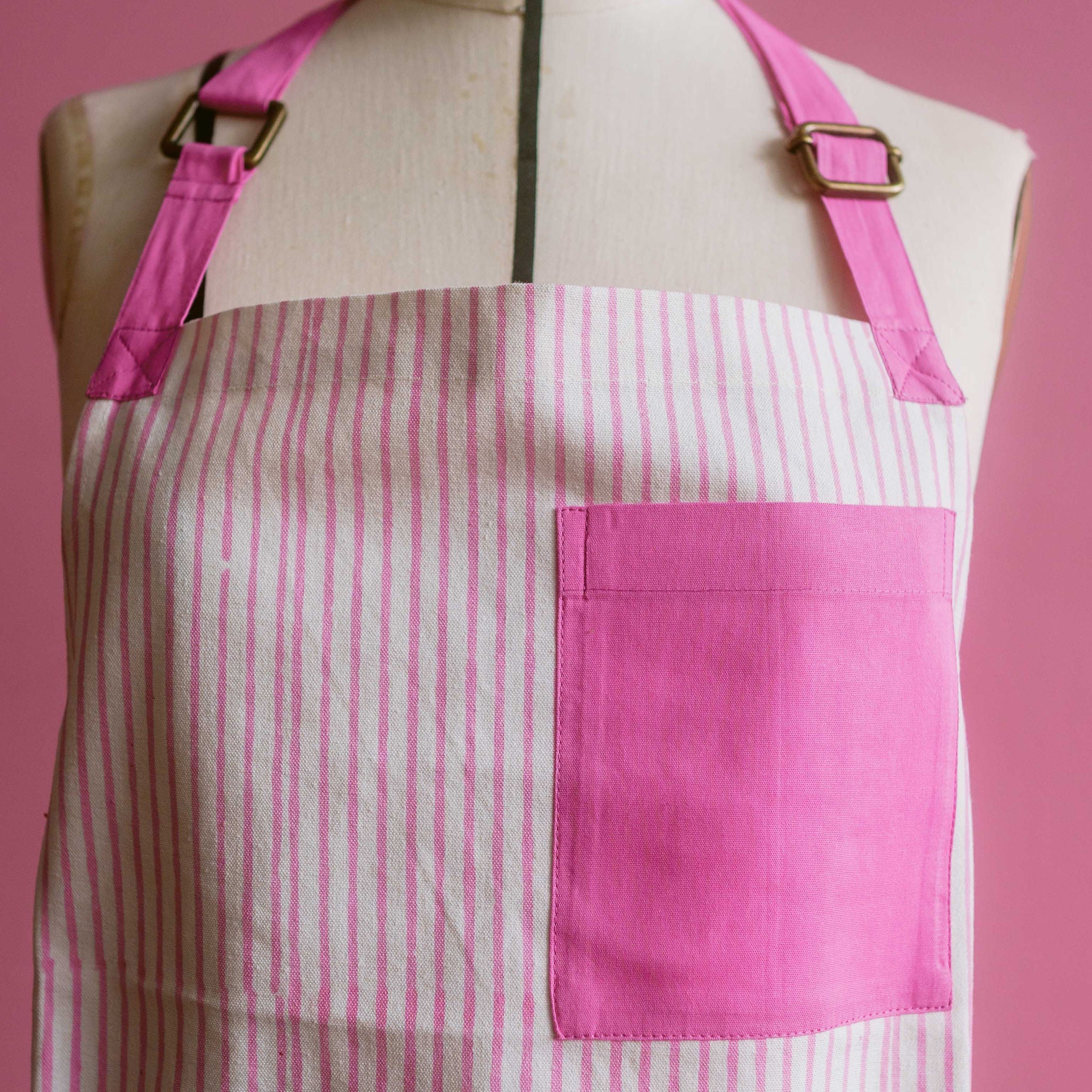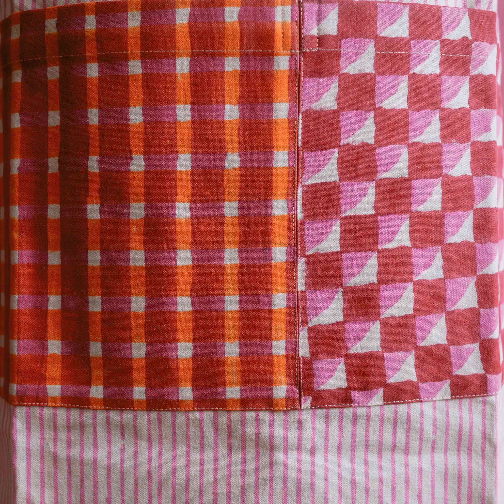Get ready to bake with the Desi Bakes Falooda Apron! Made from sustainable organic cotton duck fabric, this playful apron features beautiful stripes in pink and orange. Easily machine washable, this apron is perfect for any messy baking session. Hand printed for a unique touch.
