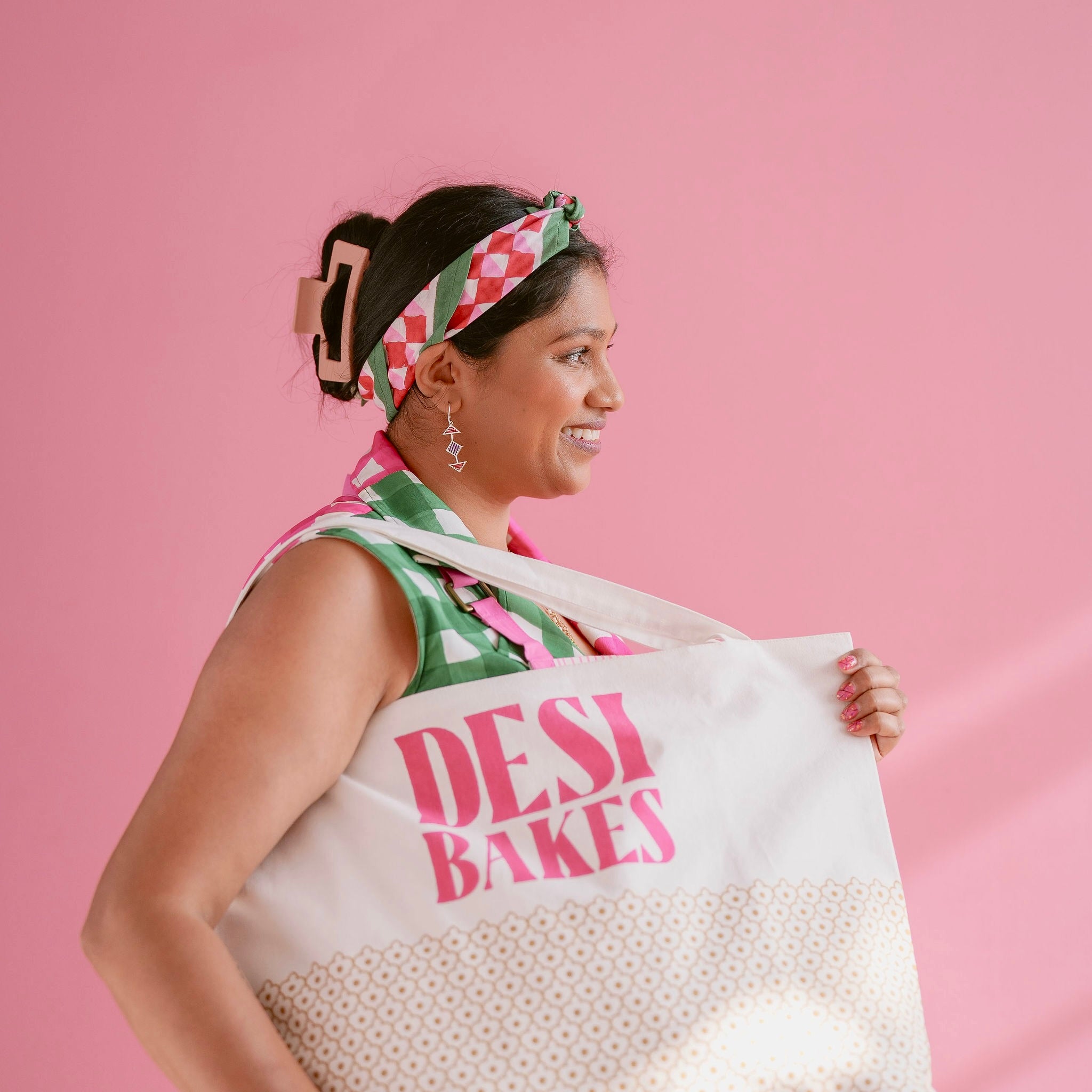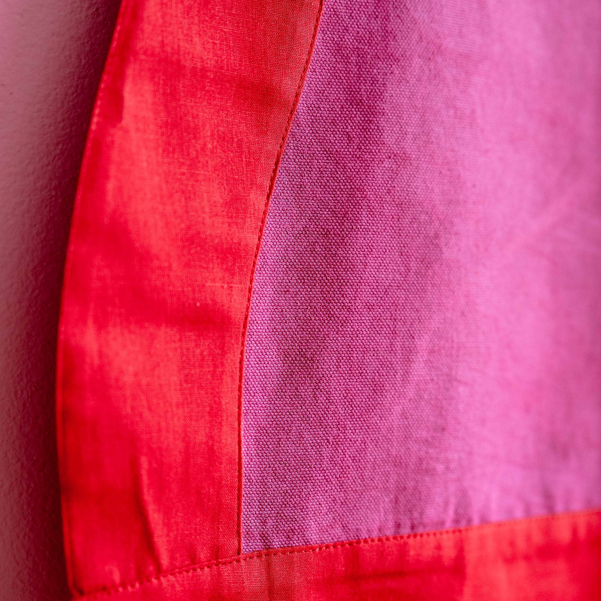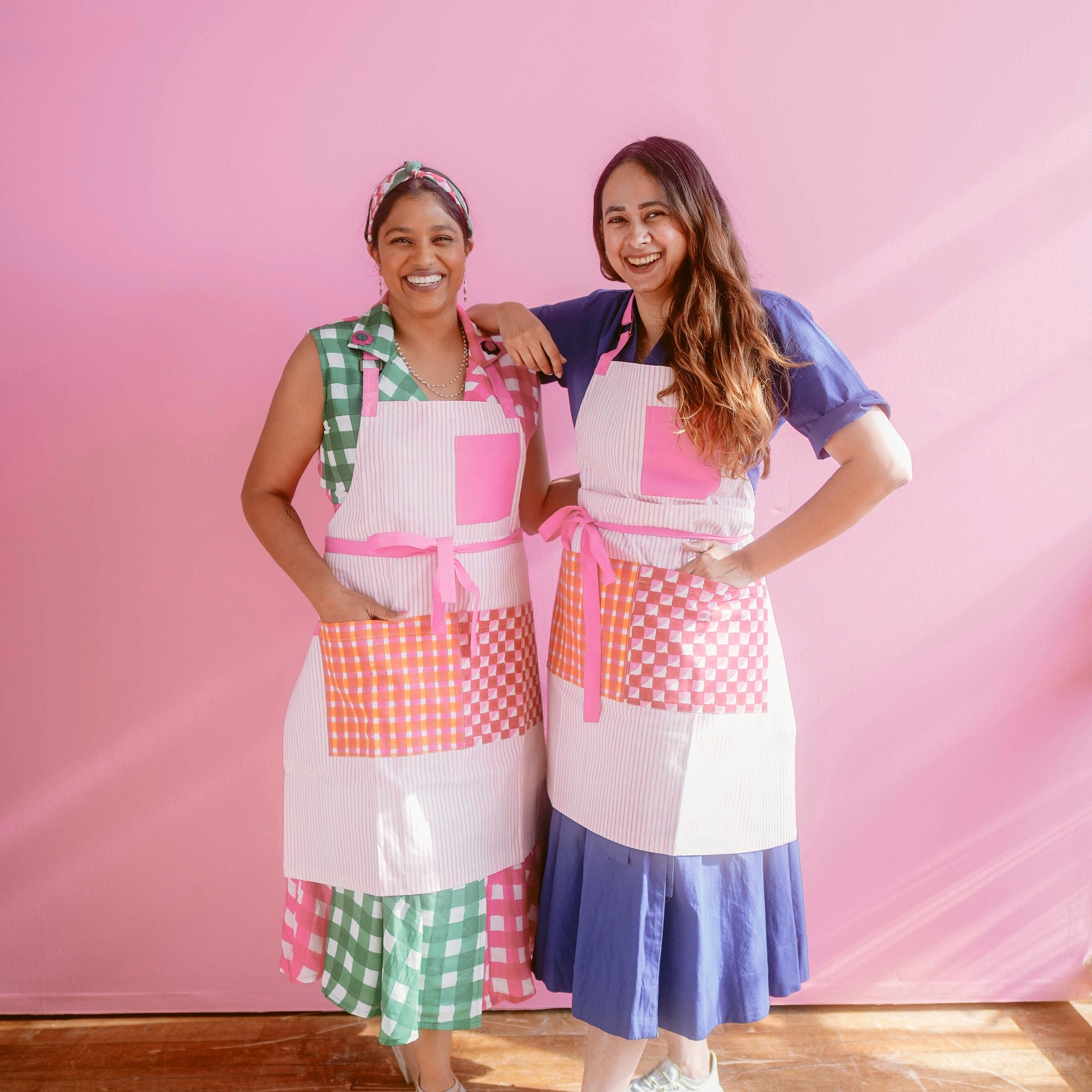 Get ready to bake with the Desi Bakes Falooda Apron! Made from sustainable organic cotton duck fabric, this playful apron features beautiful stripes in pink and orange. Easily machine washable, this apron is perfect for any messy baking session. Hand printed for a unique touch.