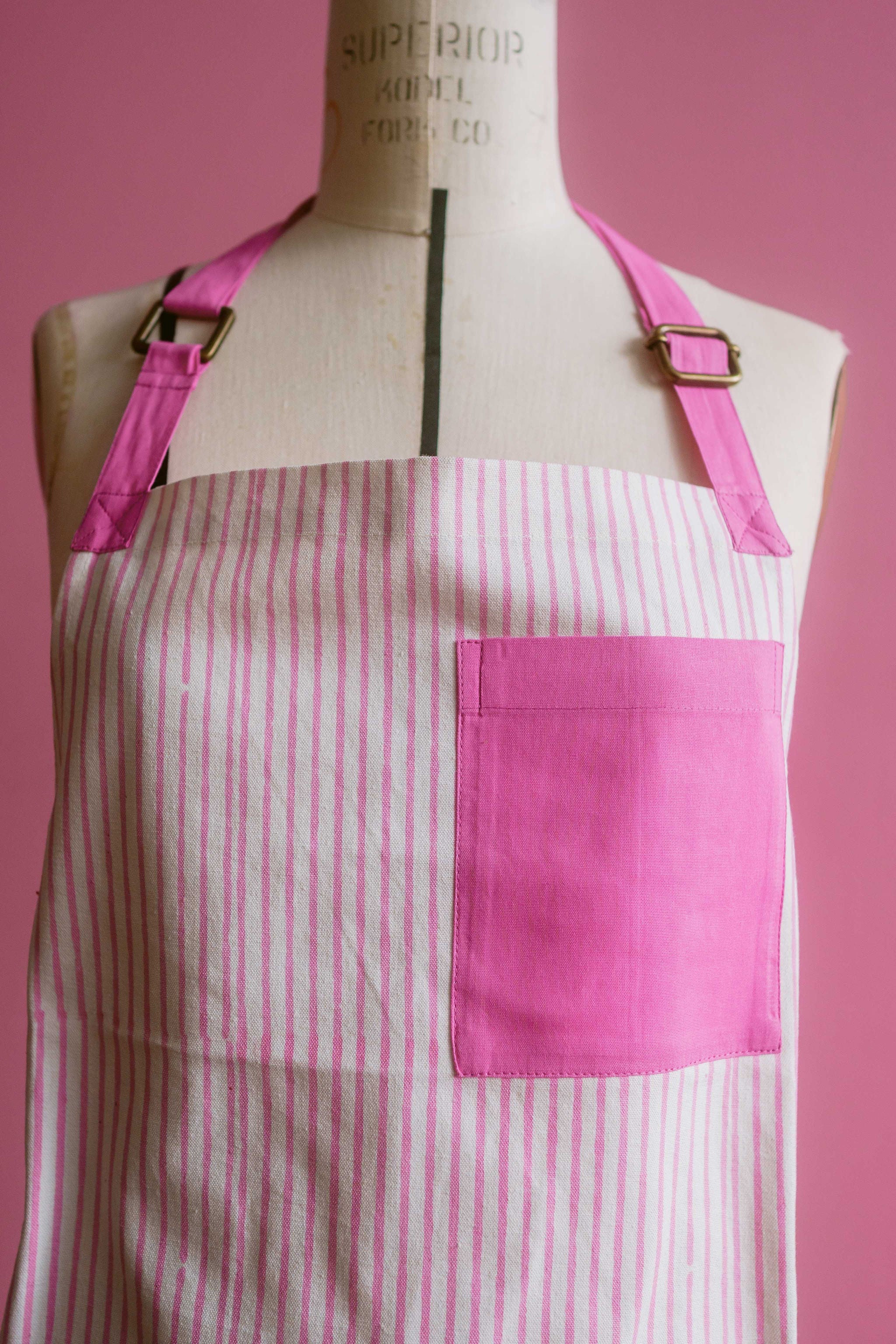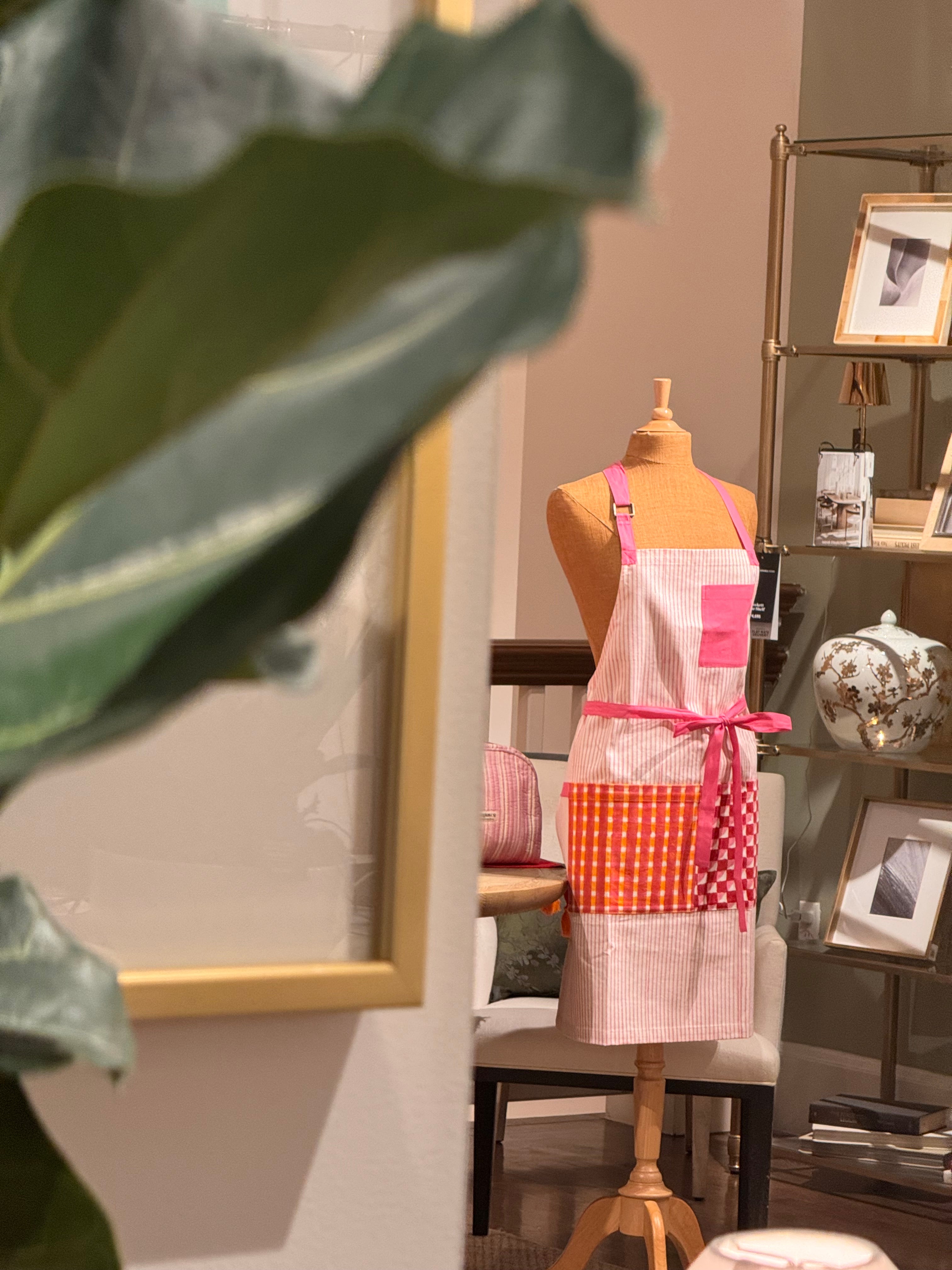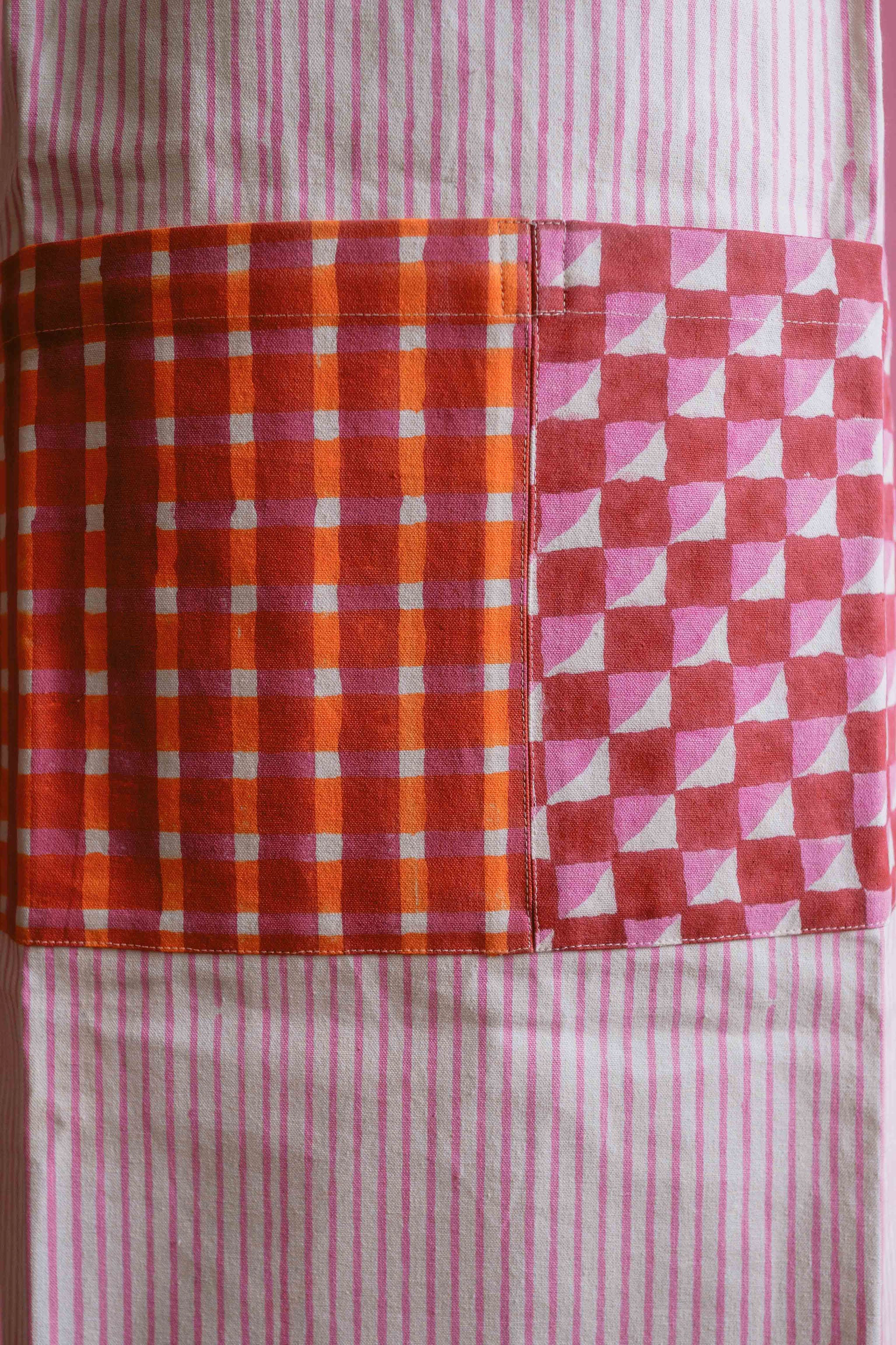 Get ready to bake with the Desi Bakes Falooda Apron! Made from sustainable organic cotton duck fabric, this playful apron features beautiful stripes in pink and orange. Easily machine washable, this apron is perfect for any messy baking session. Hand printed for a unique touch.